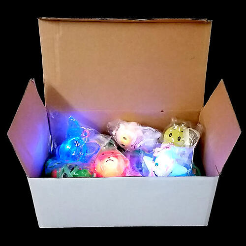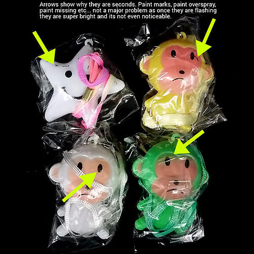 Here we have a clearance run of seconds stock. These rings and necklaces are all tested and in good working order, but the paintwork may be smudged, over-sprayed, a little scratched or just missing! Some of them may have a missing LED but the lights are still bright and colourful!